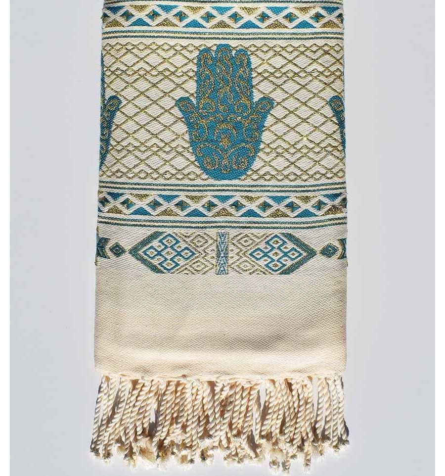 Fouta blanc crème khomsa couleur bleu bondi au fil lurex doré