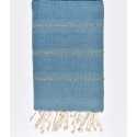 Fouta nid d'abeille bleu paon avec 3 bandes lurex doré.