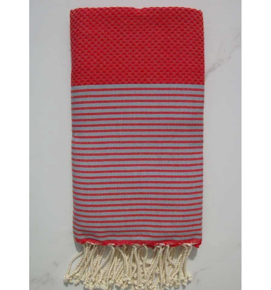 Superbe fouta nid d'abeille 100% coton de couleur rouge rayée gris
