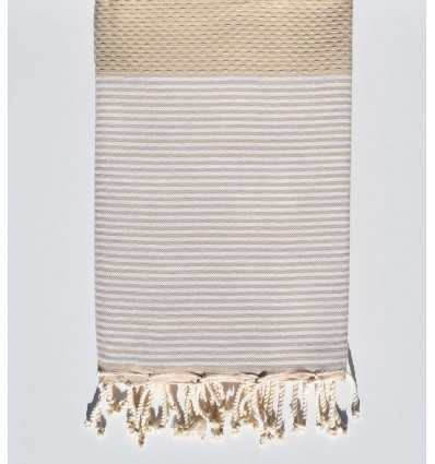Serviette de plage 100 % coton en nid d'abeille couleur beige sable avec rayures .