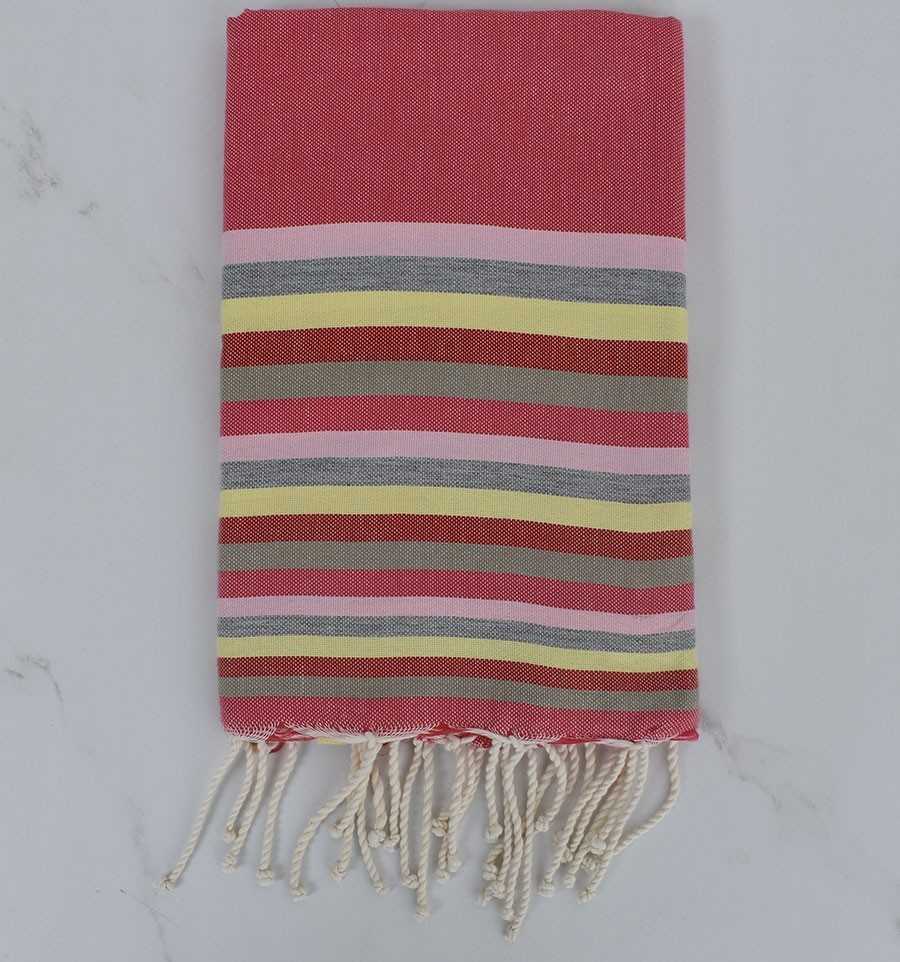 Fouta plate 6 couleurs rose, rose clair, gris, jaune, rouge et vert pale 100 % coton