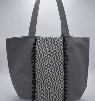 Sac Saint Tropez taupe avec motifs en chevron couleur bleu guède et pompons noire