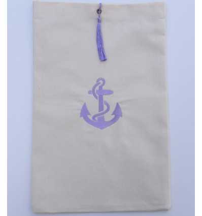 Pochette beige clair brodée motif ancre lavande avec pompon lavande